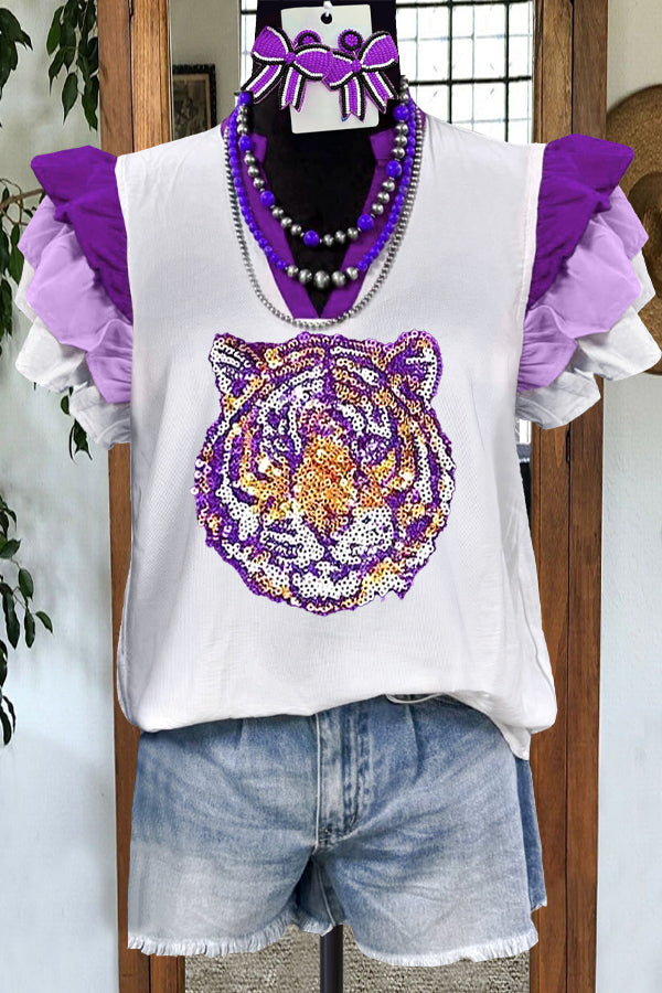 Stay on trend this season in our new elegant, v neck top. We especially love the patchwork fabric and think this piece will be a new favorite in your closet!